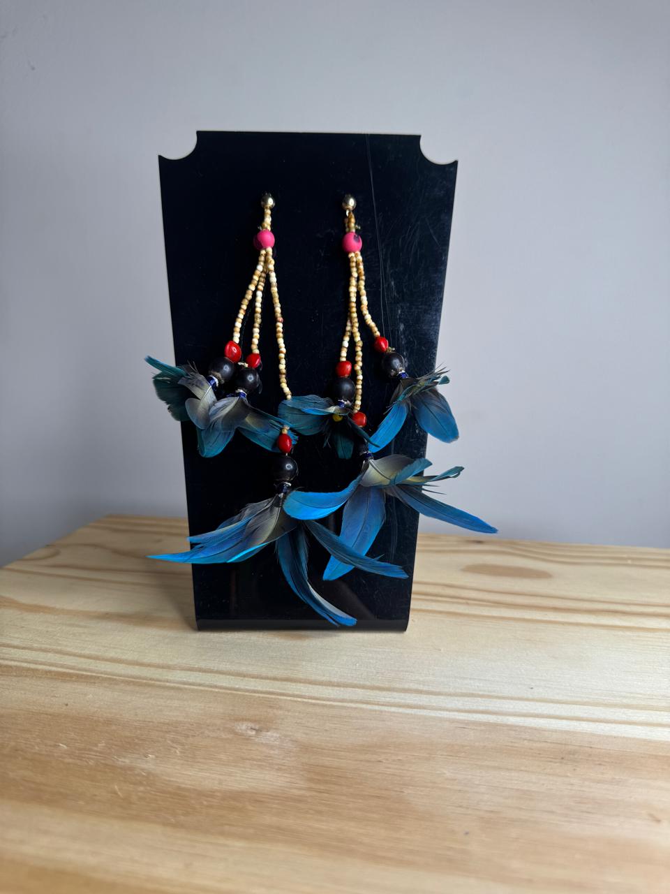 Feito à mão pelos artesãos indígenas da Aldeia Novo Horizonte, este brinco de tiririca combina penas azuis e sementes de mulungu (saboneteira), resultando em uma peça sustentável e cheia de significado. Cada detalhe reflete o respeito à natureza, a beleza das cores naturais e a riqueza da cultura indígena.