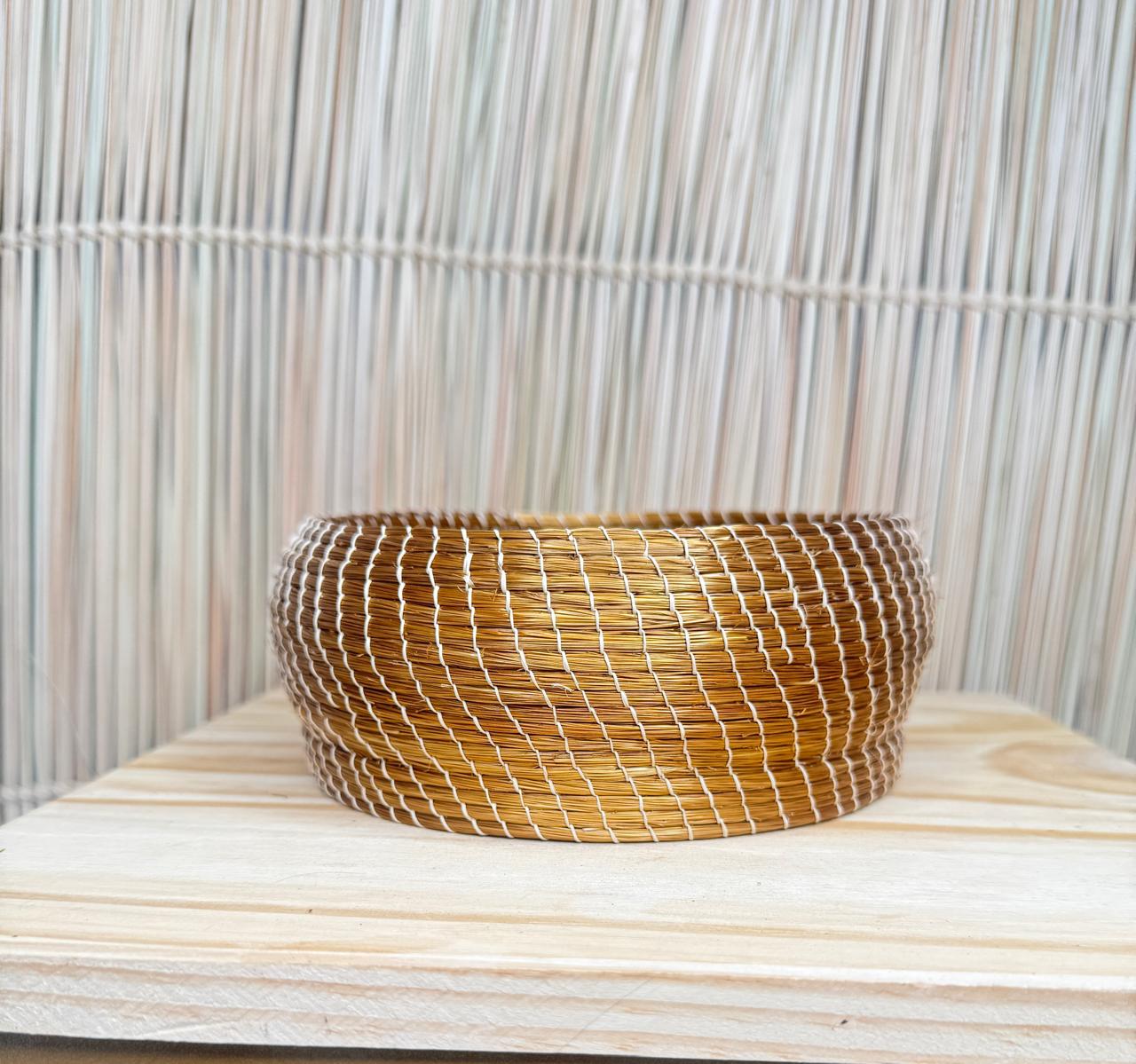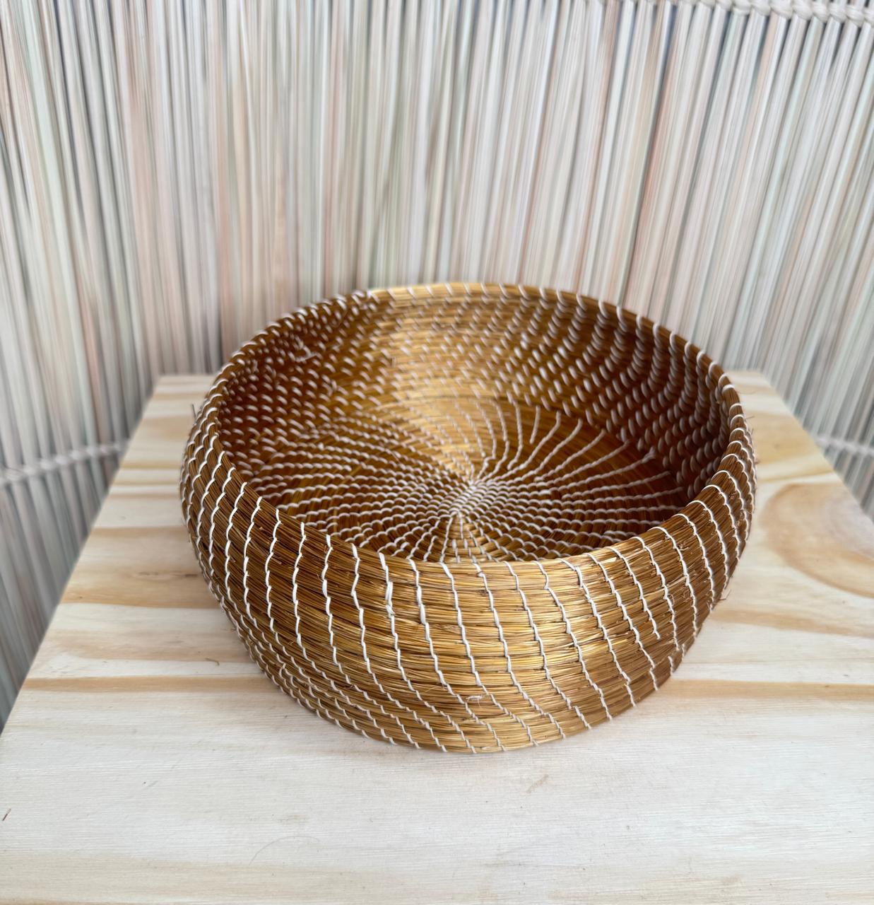 Cesta redonda de capim dourado costurada com seda de buriti.