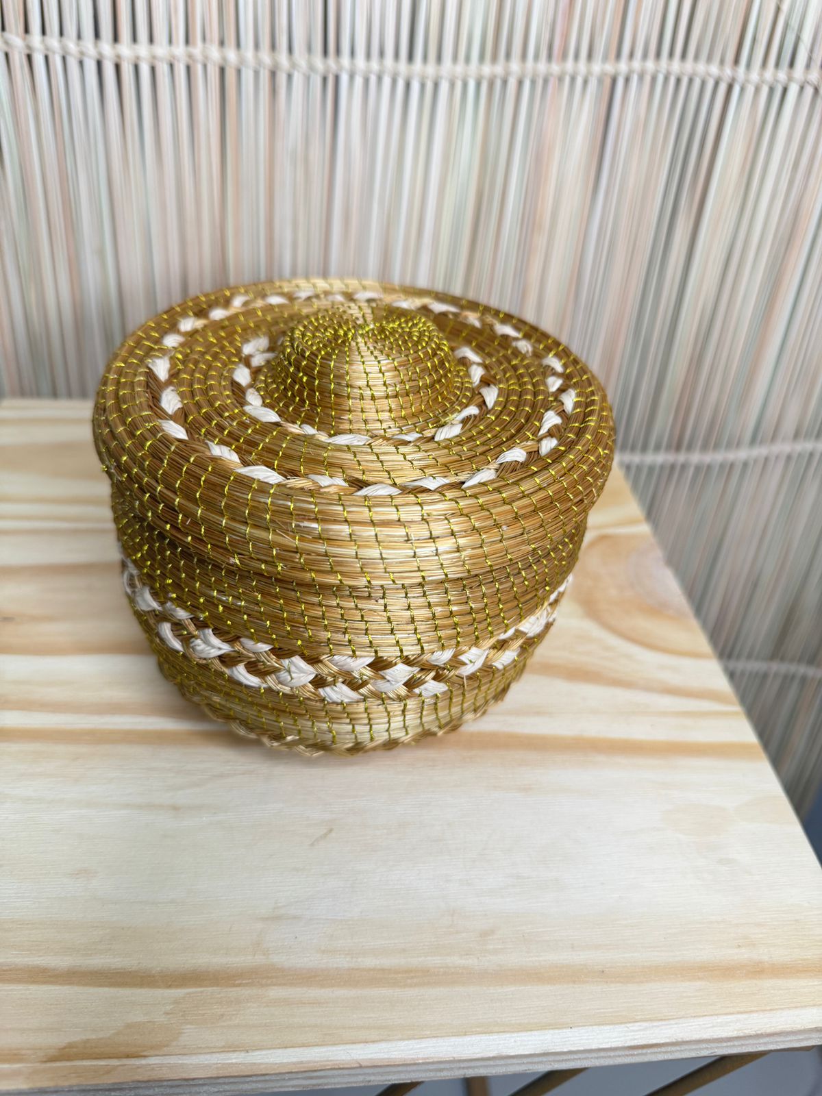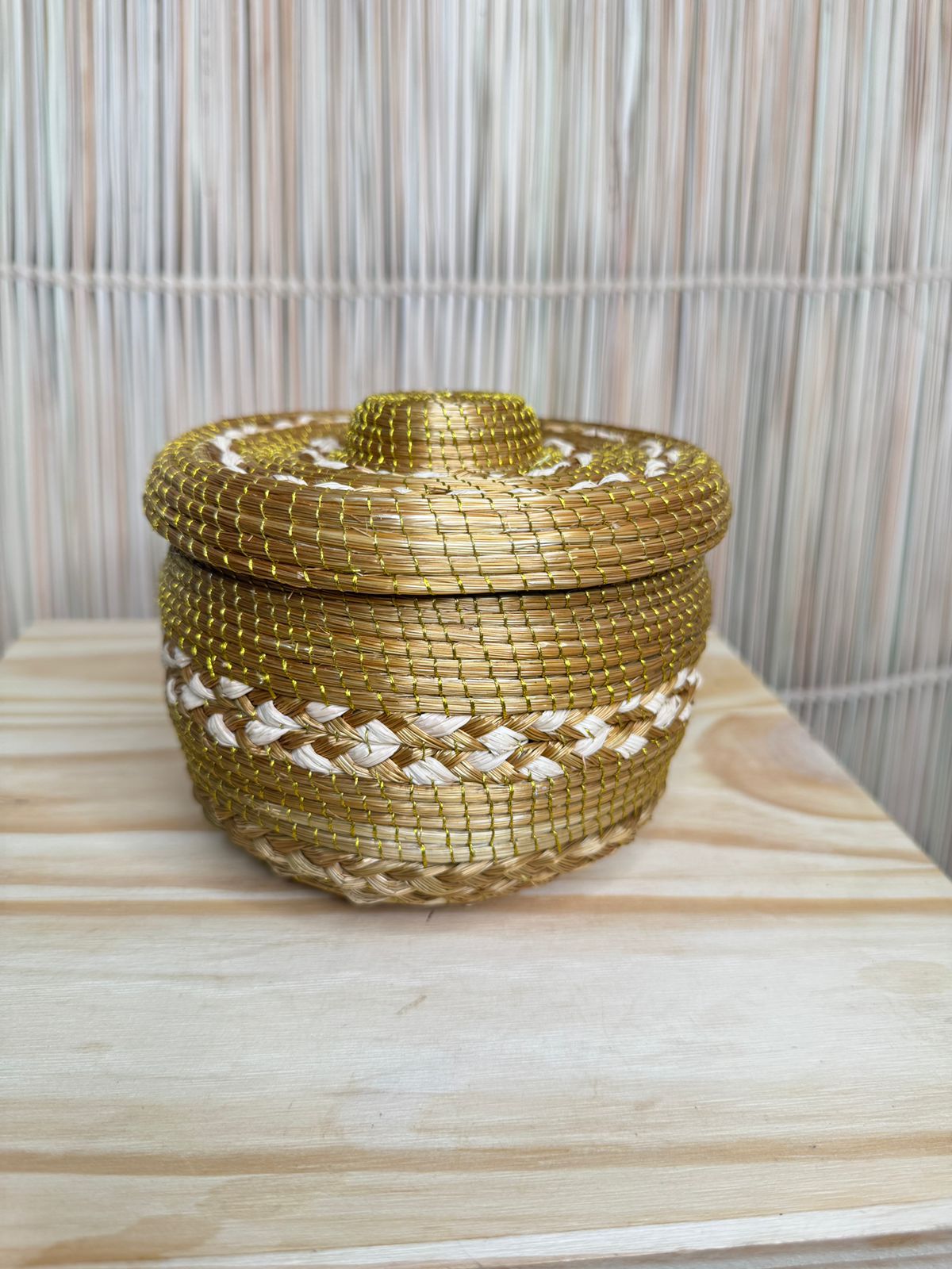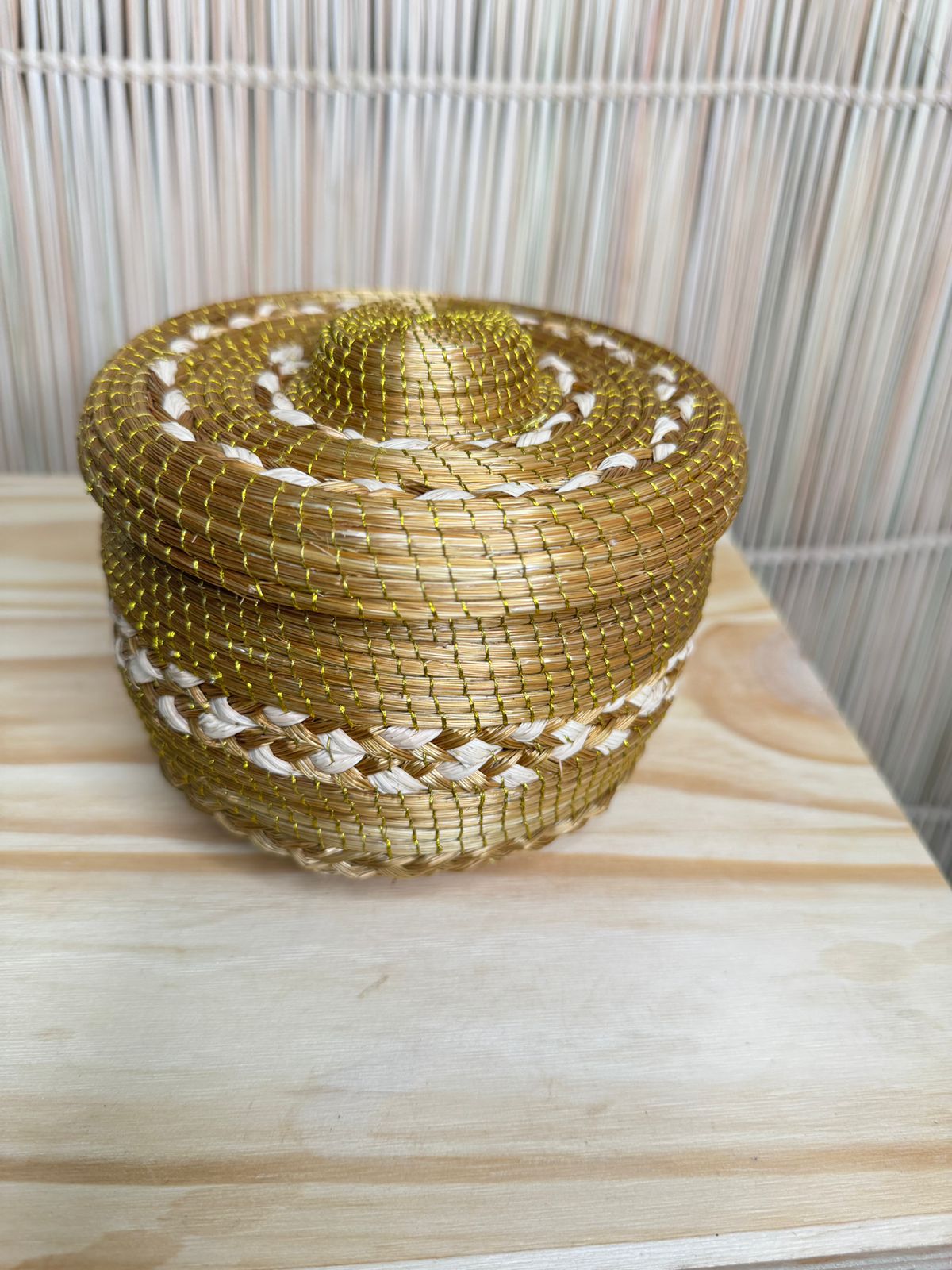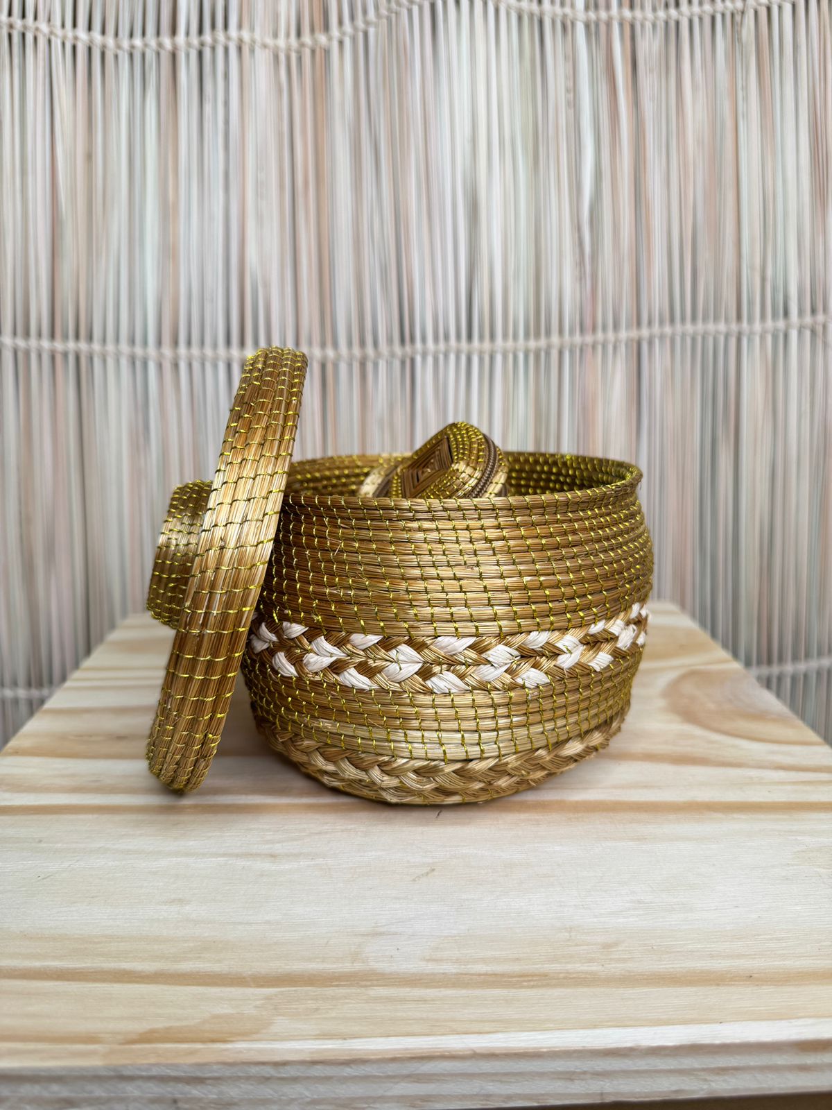 Aos 60 anos, uma mulher indígena e anciã do povo Xerente que mantém viva a tradição do artesanato aprendido com seus pais. Com sabedoria e dedicação, transforma o capim dourado em lindas bolsas e porta-joias, e a palha de buriti em sinos, cofos e esteiras que carregam a força da ancestralidade.